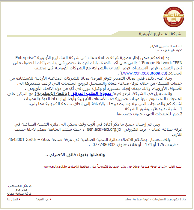 ذكر أعلاه في أقرب وقت ممكن الى دائرة التنمية الصناعية في غرفة صناعة عمان - بريد الكتروني een.aci@aci.org.jo ، حيث ستتم المتابعة معكم لاحقا حسب
