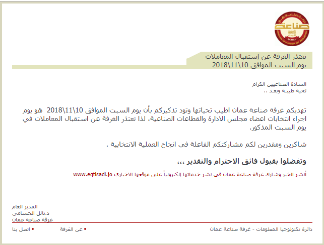 تهديكم غرفة صناعة عمان اطيب تحياتها وتود تذكيركم بأن يوم السبت الموافق