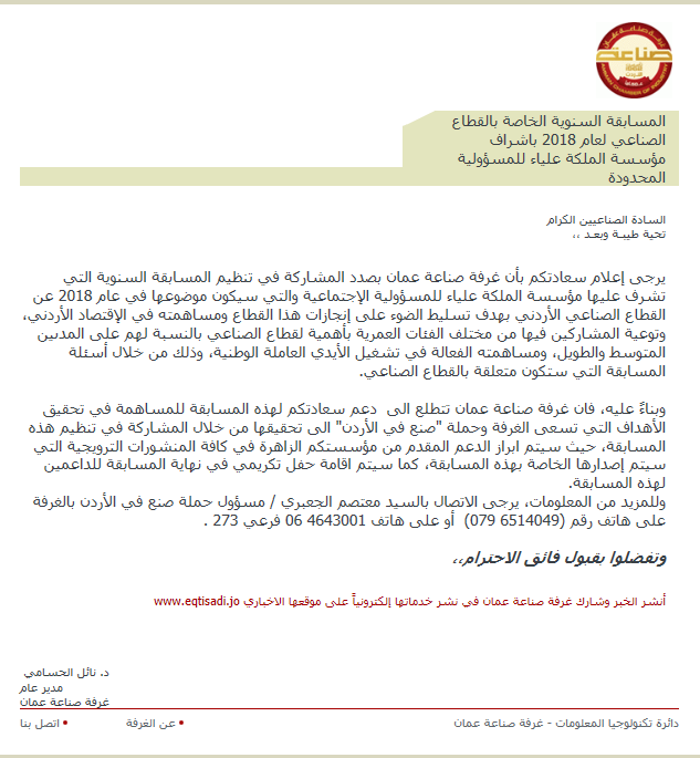 يرجى إعلام سعادتكم بأن غرفة صناعة عمان بصدد المشاركة في تنظيم المسابقة السنوية التي تشرف عليها مؤسسة الملكة علياء للمسؤولية الإجتماعية والتي سيكون موضوعها في عام 2018 عن القطاع الصناعي الأردني بهدف تسليط الضوء على إنجازات هذا القطاع ومساهمته في الإقتصاد الأردني، وتوعية المشاركين فيها من مختلف الفئات العمرية بأهمية لقطاع الصناعي بالنسبة لهم على المدىين المتوسط والطويل، ومساهمته الفعالة في تشغيل الأيدي العاملة الوطنية، وذلك من خلال أسئلة المسابقة التي ستكون متعلقة بالقطاع الصناعي.