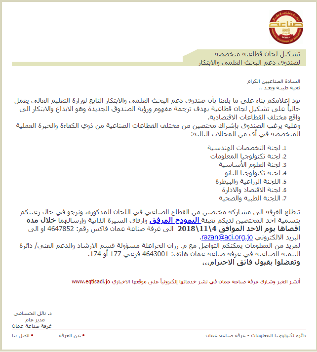 تتطلع الغرفة الى مشاركة مختصين من القطاع الصناعي في اللجان المذكورة، ونرجو في حال رغبتكم بتسمية أحد المختصين لديكم تعبئة النموذج المرفق وارفاق السيرة الذاتية وإرسالهما خلال مدة أقصاها يوم الاحد الموافق 4\11\2018  الى غرفة صناعة عمان فاكس رقم: 4647852 او الى البريد الالكتروني razan@aci.org.jo.