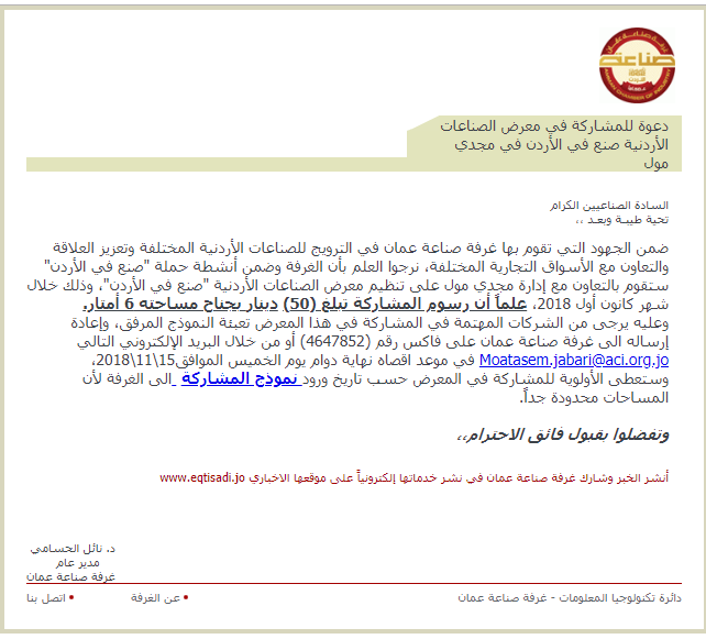 وذلك خلال شهر كانون أول 2018، علماً أن رسوم المشاركة تبلغ (50) دينار بجناح