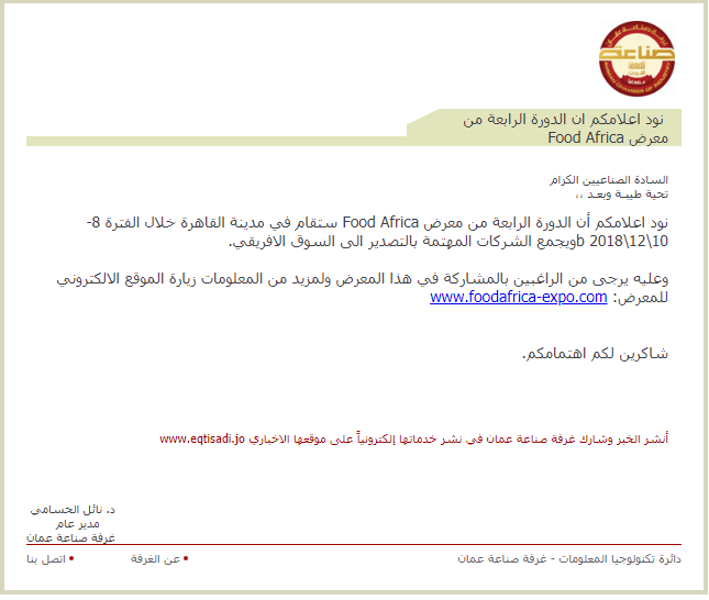 وعليه يرجى من الراغبين بالمشاركة في هذا المعرض ولمزيد من المعلومات زيارة الموقع الالكتروني للمعرض: www.foodafrica-expo.com