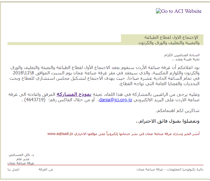 نود اعلامكم أن غرفة صناعة الأردن ستقوم بعقد الاجتماع الأول لقطاع الطباعة والتعبئة والتغليف والورق والكرتون واللوازم المكتبية، والذي سيعقد في مقر غرفة صناعة عمان يوم السبت الموافق 8\12\2018  في تمام الساعة الحادية عشرة صباحا، حيث يهدف الاجتماع لتشكيل مجلس استشاري للقطاع وبحث التحديات والقضايا العامة التي تواجه القطاع.