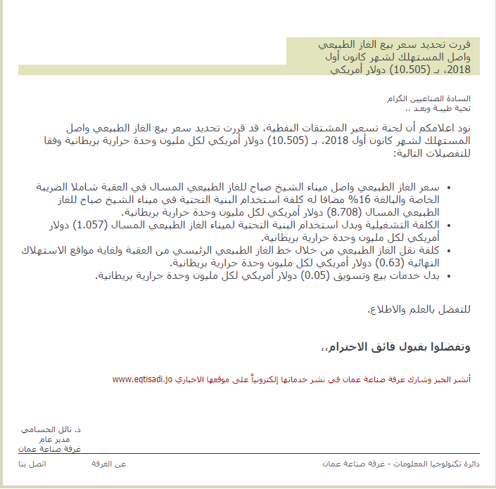 نود اعلامكم أن لجنة تسعير المشتقات النفطية، قد قررت تحديد سعر بيع الغاز الطبيعي واصل المستهلك لشهر كانون أول 2018، بـ (10.505) دولار أمريكي لكل مليون وحدة حرارية بريطانية وفقا للتفصيلات التالية: