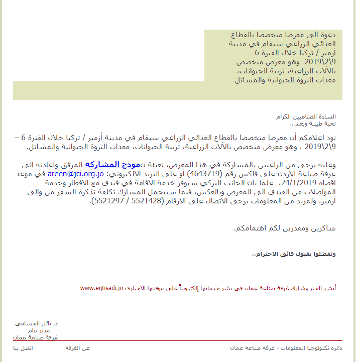 وعليه يرجى من الراغبين بالمشاركة في هذا المعرض، تعبئة نموذج المشاركة المرفق واعادته الى غرفة صناعة الاردن على فاكس رقم (4643719) أو على البريد الالكتروني: areen@jci.org.jo في موعد اقصاه 24/1/2019،  علما بأن الجانب التركي سيوفر خدمة الاقامة في فندق مع الافطار وخدمة المواصلات من الفندق الى المعرض وبالعكس، فيما سيتحمل المشارك تكلفة تذكرة السفر من والى أزمير، ولمزيد من المعلومات يرجى الاتصال على الارقام (5521428 / 5521297).