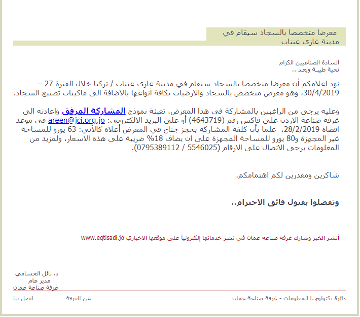 الالكتروني: areen@jci.org.jo في موعد اقصاه 28/2/2019، علما بأن كلفة المشاركة بحجز جناح في المعرض