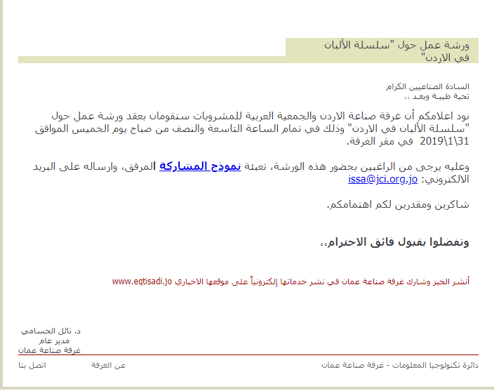 نود اعلامكم أن غرفة صناعة الاردن والجمعية العربية للمشروبات ستقومان بعقد ورشة عمل حول "سلسلة الألبان في الاردن" وذلك في تمام الساعة التاسعة والنصف من صباح يوم الخميس الموافق 31\1\2019  في مقر الغرفة.