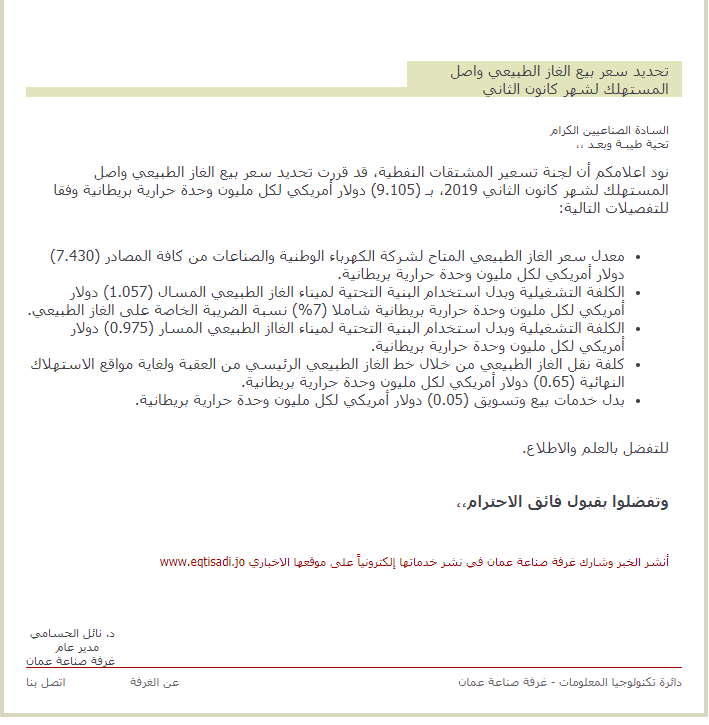 نود اعلامكم أن لجنة تسعير المشتقات النفطية، قد قررت تحديد سعر بيع الغاز الطبيعي واصل المستهلك لشهر كانون الثاني 2019، بـ (9.105) دولار أمريكي لكل مليون وحدة حرارية بريطانية وفقا للتفصيلات التالية: