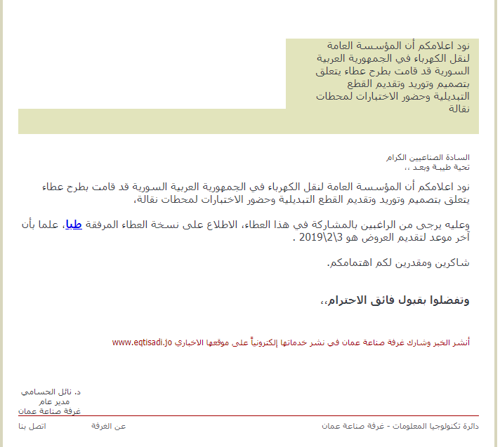 نود اعلامكم أن المؤسسة العامة لنقل الكهرباء في الجمهورية العربية