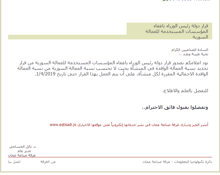 لا تحتسب نسبة العمالة السورية من نسبة العمالة الوافدة الاجمالية المقررة لكل