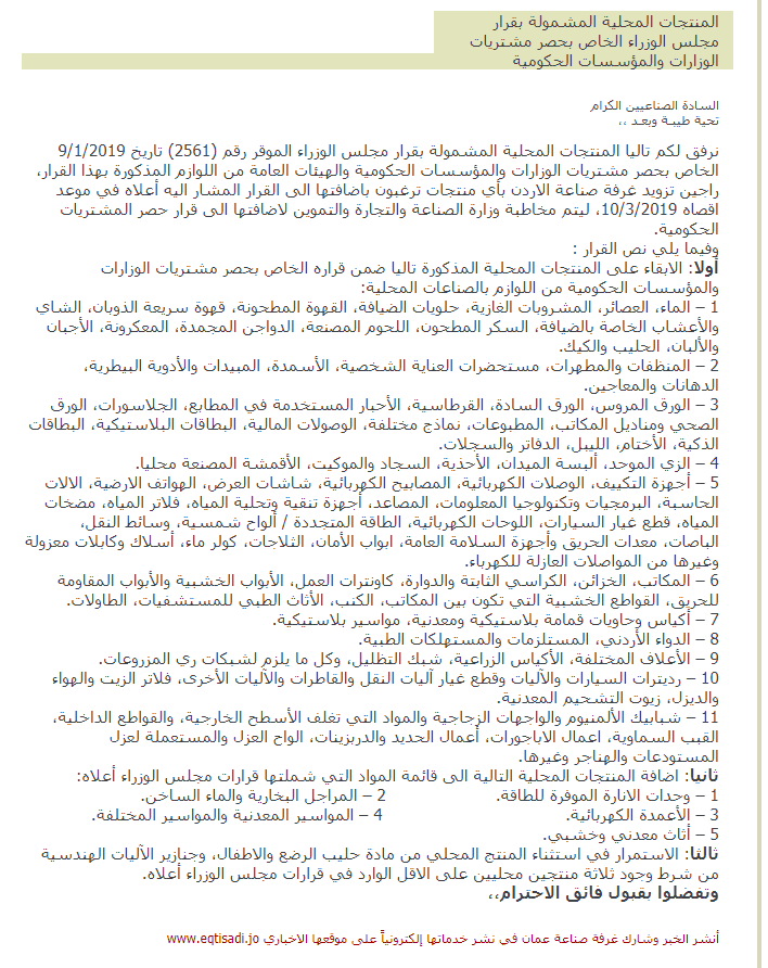 صناعة الاردن بأي منتجات ترغبون باضافتها الى القرار المشار اليه أعلاه في موعد