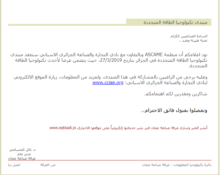 وعليه يرجى من الراغبين بالمشاركة في هذا المنتدى، ولمزيد من المعلومات، زيارة الموقع الالكتروني لنادي التجارة والصناعة الجزائري الاسباني: www.cciae.org