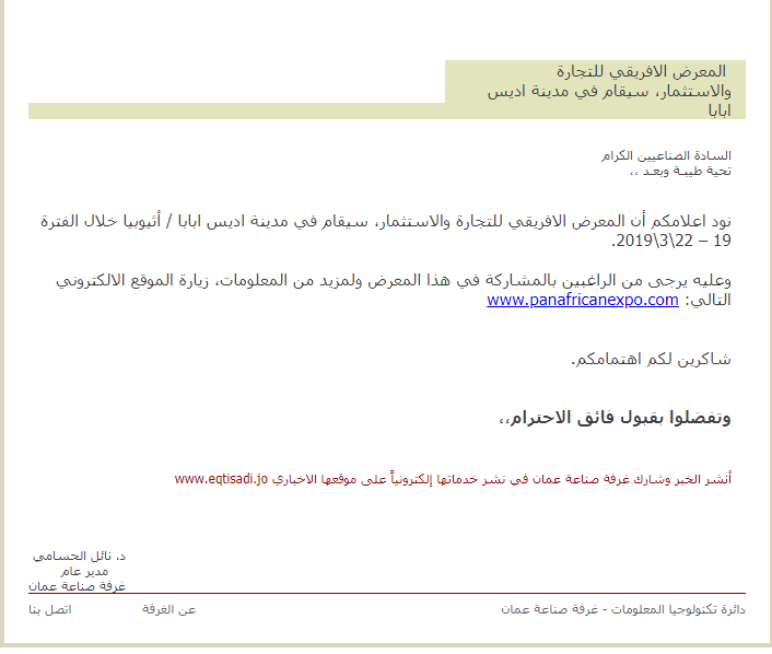 وعليه يرجى من الراغبين بالمشاركة في هذا المعرض ولمزيد من المعلومات، زيارة الموقع الالكتروني التالي: www.panafricanexpo.com