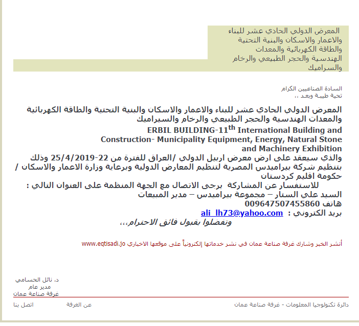 والذي سيعقد على ارض معرض اربيل الدولي /العراق للفترة من 22-25/4/2019 وذلك