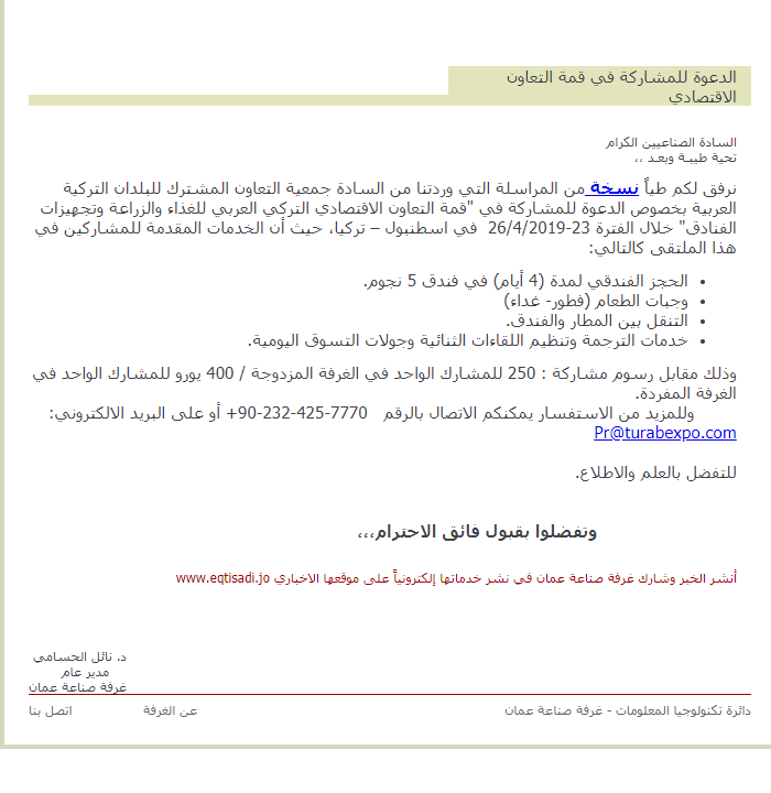 نرفق لكم طياً نسخة من المراسلة التي وردتنا من السادة جمعية التعاون المشترك للبلدان التركية العربية بخصوص الدعوة للمشاركة في "قمة التعاون الاقتصادي التركي العربي للغذاء والزراعة وتجهيزات الفنادق" خلال الفترة 23-26/4/2019  في اسطنبول – تركيا، حيث أن الخدمات المقدمة للمشاركين في هذا الملتقى كالتالي: