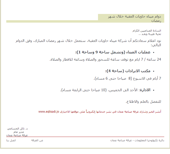 نود اعلام سعادتكم أن شركة ميناء حاويات العقبة، ستعمل خلال شهر