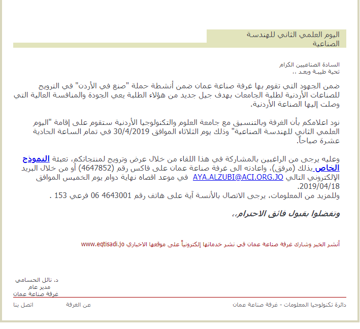 نود اعلامكم بأن الغرفة وبالتنسيق مع جامعة العلوم والتكنولوجيا الأردنية