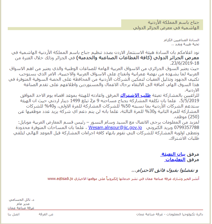 نود اعلامكم بان السادة هيئة الاستثمار الاردن بصدد تنظيم جناح