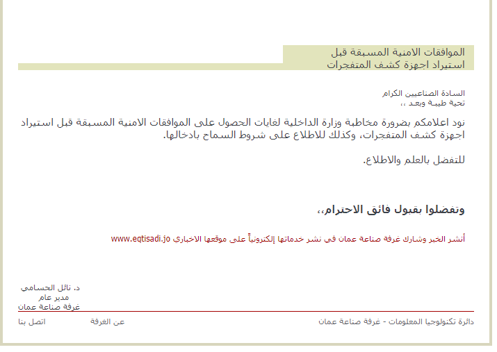 نود اعلامكم بضرورة مخاطبة وزارة الداخلية لغايات الحصول على الموافقات الامنية المسبقة قبل استيراد اجهزة كشف المتفجرات، وكذلك للاطلاع على شروط السماح بادخالها. للتفضل بالعلم والاطلاع. وتفضلوا بقبول فائق الاحترام،،