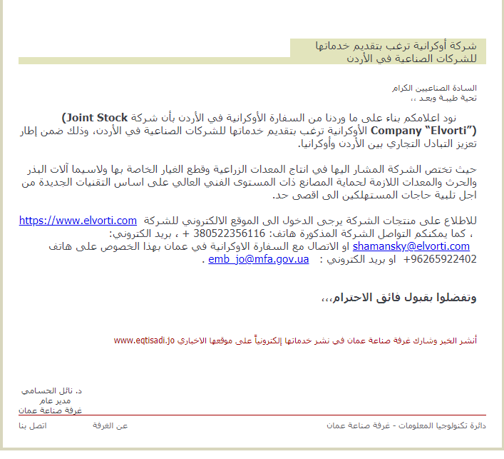 نود اعلامكم بناء على ما وردنا من السفارة الأوكرانية في الأردن بأن شركة (Joint Stock Company “Elvorti”) الأوكرانية ترغب بتقديم خدماتها للشركات الصناعية في الأردن، وذلك ضمن إطار تعزيز التبادل التجاري بين الأردن وأوكرانيا.