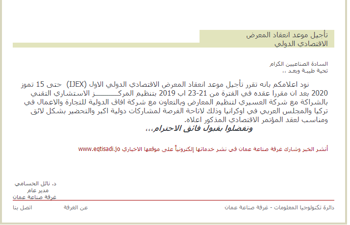 تأجيل موعد انعقاد المعرض الاقتصادي الدولي الاول (IJEX) حتى 15 تموز 2020 بعد ان مقررا عقده