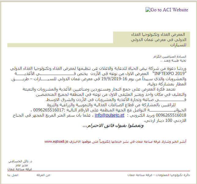 وردتنا دعوة من شركة نبض الحياة للدعاية والاعلان عن تنظيمها لمعرض الغذاء وتكنولوجيا الغذاء الدولي “INFTEXPO 2019” المعرض الاول من نوعه في الأردن يختص فـــــــــــــــــــــــــــــــي الأغذيـــــــة والمشروبات والذي سيبدأ من يوم 16-19/9/2019 في معرض عمان الدولي للسيــــــارات – طريـــــــق المطار بمشاركة دولية.