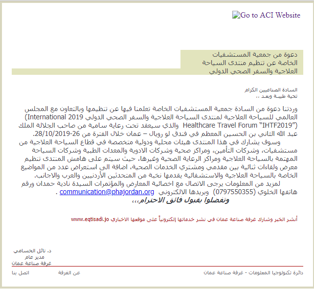 وردتنا دعوة من السادة جمعية المستشفيات الخاصة تعلمنا فيها عن تنظيمها وبالتعاون مع المجلس العالمي للسياحة العلاجية لمنتدى السياحة العلاجية والسفر الصحي الدولي 2019 (International Healthcare Travel Forum “IHTF2019”) والذي سيعقد تحت رعاية سامية من صاحب الجلالة الملك عبد الله الثاني بن الحسين المعظم في فندق لو رويال – عمان خلال الفترة من 26-28/10/2019.