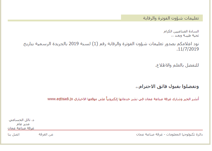 نود اعلامكم بصدور تعليمات شؤون الفوترة والرقابة رقم (1) لسنة 2019 بالجريدة الرسمية بتاريخ 11/7/2019. للتفضل بالعلم والاطلاع. وتفضلوا بقبول فائق الاحترام،،