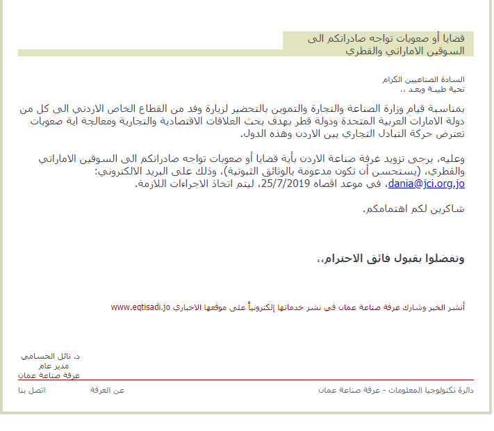 وعليه، يرجى تزويد غرفة صناعة الاردن بأية قضايا أو صعوبات تواجه صادراتكم الى السوقين الاماراتي والقطري، (يستحسن أن تكون مدعومة بالوثائق الثبوتية)، وذلك على البريد الالكتروني: dania@jci.org.jo، في موعد اقصاه 25/7/2019، ليتم اتخاذ الاجراءات اللازمة.