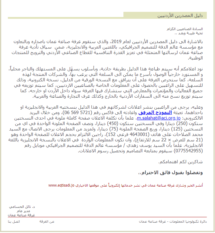 تدعوكم غرفة صناعة عمان للإعلان والترويج لمنتجاتكم ضمن دليل المصدرين الأردنيين