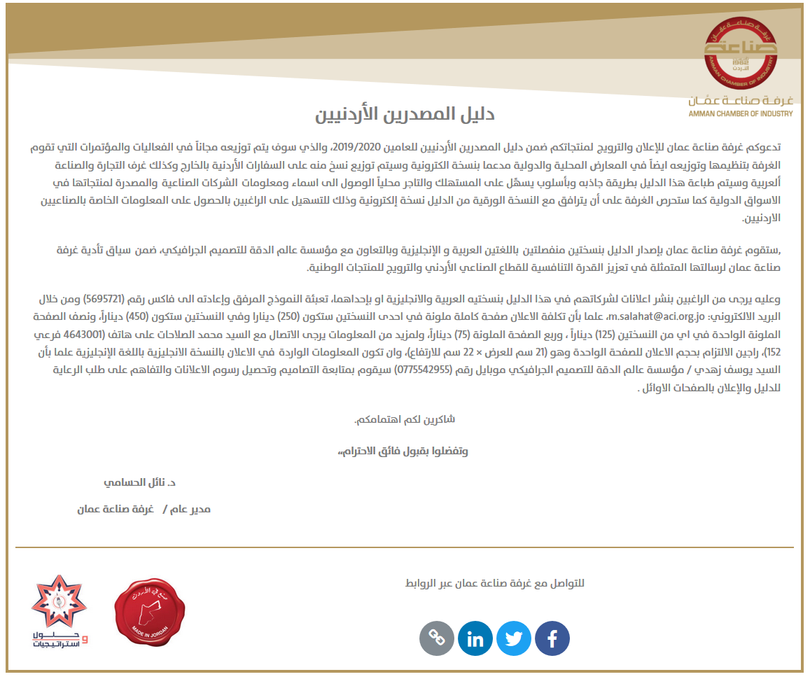 تدعوكم غرفة صناعة عمان للإعلان والترويج لمنتجاتكم ضمن دليل المصدرين الأردنيين للعامين 2019/2020