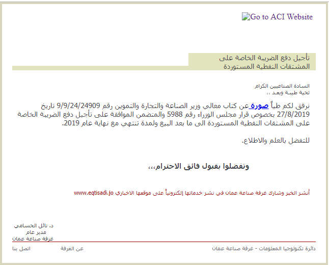 نرفق لكم طياً صورة عن كتاب معالي وزير الصناعة والتجارة والتموين رقم 9/9/24/24909 تاريخ 27/8/2019 بخصوص قرار مجلس الوزراء رقم 5988 والمتضمن الموافقة على تأجيل دفع الضريبة الخاصة على المشتقات النفطية المستوردة الى ما بعد البيع ولمدة تنتهي مع نهاية عام 2019.