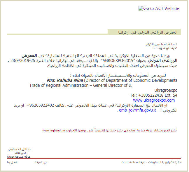 وردتنا دعوة من السفارة الاوكرانية في المملكة الاردنية الهاشمية للمشاركة في المعرض الزراعي الدولي بعنوان  “AGROEXPO-2019” والذي سيعقد في اوكرانيا خلال الفترة 25-28/9/2019 ، حيث سيتناول المعرض احدث التقنيات والاساليب المبتكرة في الانظمة الزراعية.