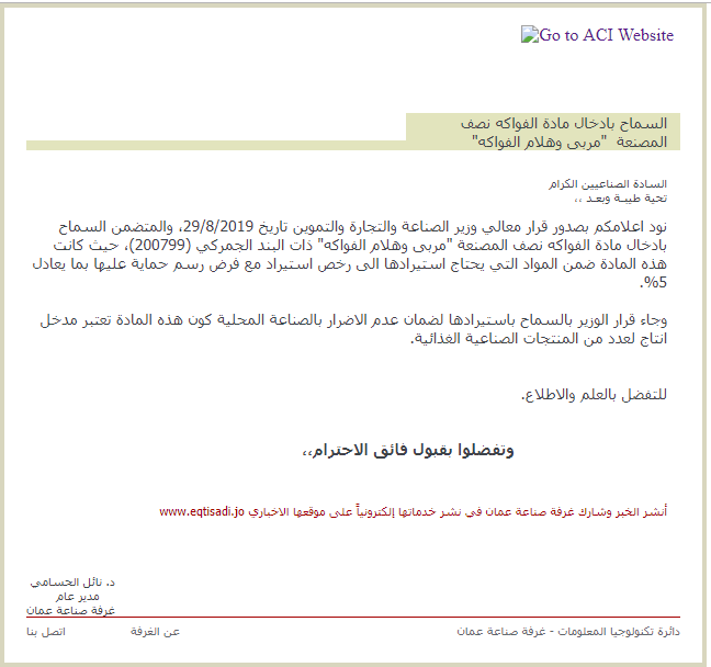 نود اعلامكم بصدور قرار معالي وزير الصناعة والتجارة والتموين تاريخ 29/8/2019، والمتضمن السماح بادخال مادة الفواكه نصف المصنعة "مربى وهلام الفواكه" ذات البند الجمركي (200799)، حيث كانت هذه المادة ضمن المواد التي يحتاج استيرادها الى رخص استيراد مع فرض رسم حماية عليها بما يعادل 5%.