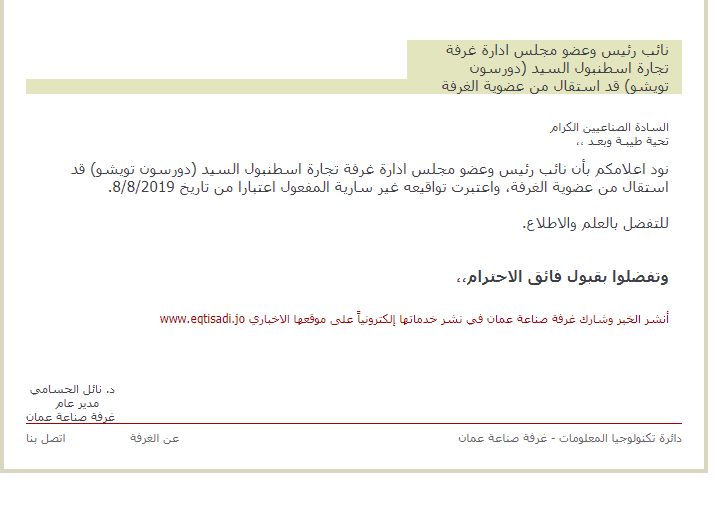 نود اعلامكم بأن نائب رئيس وعضو مجلس ادارة غرفة تجارة اسطنبول