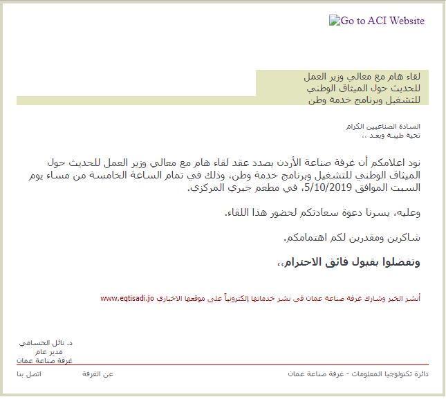 نود اعلامكم أن غرفة صناعة الأردن بصدد عقد لقاء هام مع معالي وزير العمل للحديث حول الميثاق الوطني للتشغيل وبرنامج خدمة وطن، وذلك في تمام الساعة الخامسة من مساء يوم السبت الموافق 5/10/2019، في مطعم جبري المركزي.