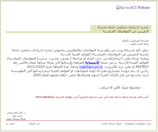 وعليه، وبناءا على احتياجاتكم من حيث اعداد او مراجعة ( تعديل، تحديث، سحب) المواصفات القياسية/ القواعد الفنية الاردنية، يرجى تعبئة الإستبانة المرفقة وإرسالها الى غرفة صناعة عمان فاكس رقم 4647852 او على بريد الكتروني: rose@aci.org.jo وخلال مدة اقصاها تاريخ 20/11/2019.