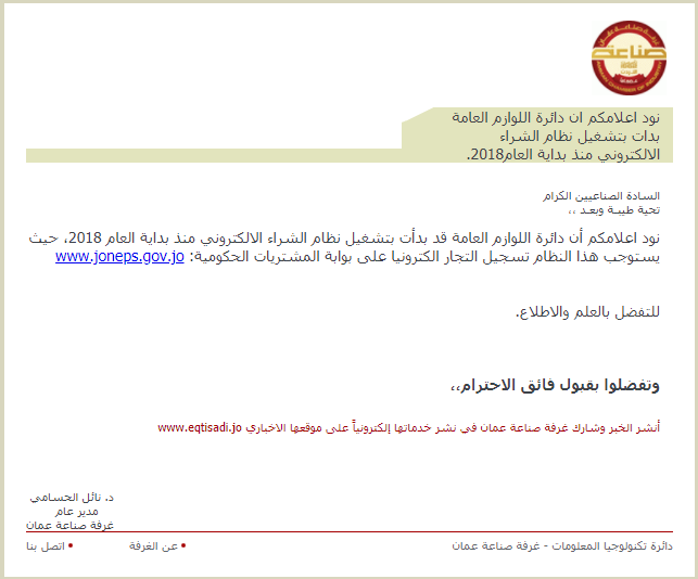 نود اعلامكم أن دائرة اللوازم العامة قد بدأت بتشغيل نظام الشراء الالكتروني منذ بداية العام 2018، حيث يستوجب هذا النظام تسجيل التجار الكترونيا على بوابة المشتريات الحكومية: www.joneps.gov.jo
