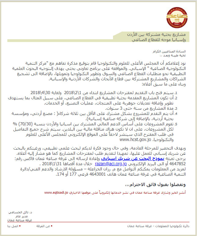 نود إعلامكم أن المجلس الأعلى للعلوم والتكنولوجيا قام بتوقيع مذكرة تفاهم مع "مركز التنمية التكنولوجية الصناعية " الإسباني. والموافقة على برنامج تعاوني بحثي يهدف إلىتوجيه البحوث العلمية التطبيقية نحو متطلبات القطاع الصناعي والسوق وتطوير التكنولوجيا وتمويلها، بالإضافة الى تشجيع الشراكات والمشاريع المشتركة بين قطاع الأبحاث والشركات الأردنية والإسبانية.