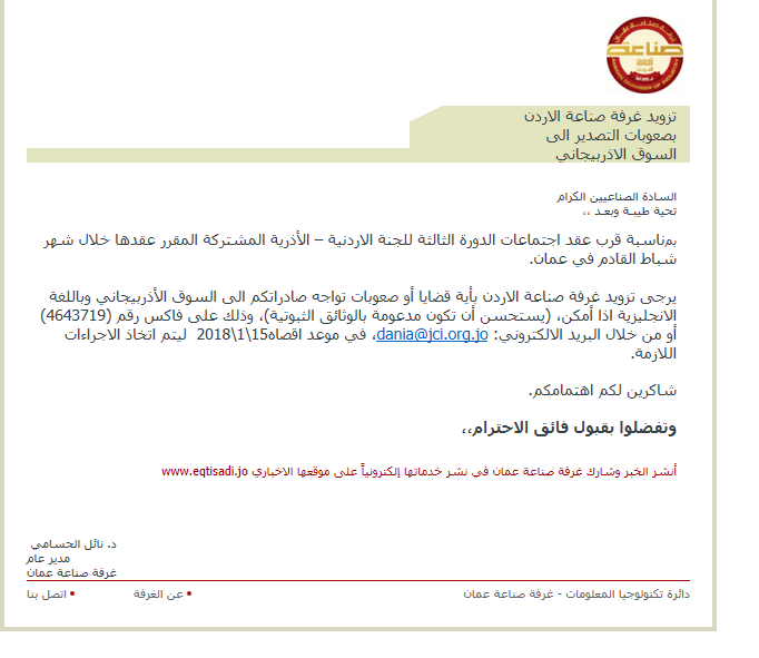 يرجى تزويد غرفة صناعة الاردن بأية قضايا أو صعوبات تواجه صادراتكم الى السوق الأذربيجاني وباللغة الانجليزية اذا أمكن، (يستحسن أن تكون مدعومة بالوثائق الثبوتية)، وذلك على فاكس رقم (4643719) أو من خلال البريد الالكتروني: dania@jci.org.jo، في موعد اقصاه15\1\2018 ليتم اتخاذ الاجراءات اللازمة.