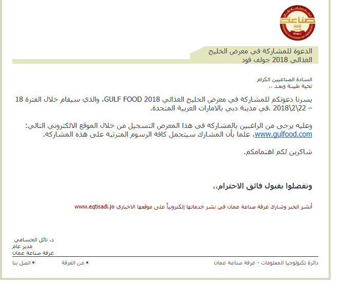 يسرنا دعوتكم للمشاركة في معرض الخليج الغذائي GULF FOOD 2018، والذي سيقام خلال الفترة 18 – 22\2\2018 .في مدينة دبي بالامارات العربية المتحدة.