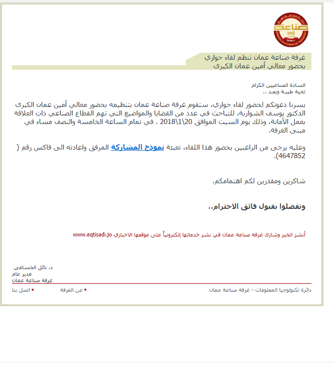 يسرنا دعوتكم لحضور لقاء حواري، ستقوم غرفة صناعة عمان بتنظيمه بحضور معالي أمين عمان الكبرى الدكتور يوسف الشواربة، للتباحث في عدد من القضايا والمواضيع التي تهم القطاع الصناعي ذات العلاقة بعمل الأمانة، وذلك يوم السبت الموافق 20\1\2018 . في تمام الساعة الخامسة والنصف مساء في مبنى الغرفة.