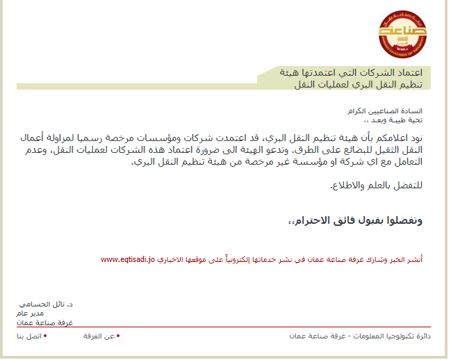 نود اعلامكم بأن هيئة تنظيم النقل البري، قد اعتمدت شركات ومؤسسات مرخصة رسميا لمزاولة أعمال النقل الثقيل للبضائع على الطرق. وتدعو الهيئة الى ضرورة اعتماد هذه الشركات لعمليات النقل، وعدم التعامل مع اي شركة او مؤسسة غير مرخصة من هيئة تنظيم النقل البري.