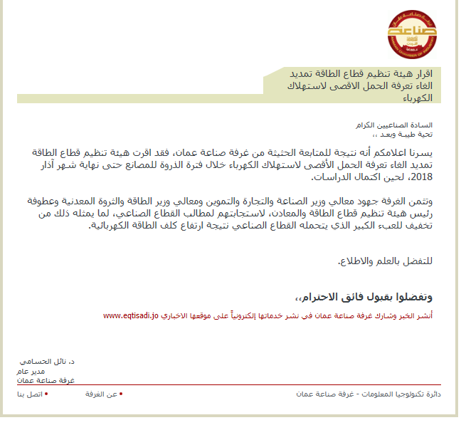 يسرنا اعلامكم أنه نتيجة للمتابعة الحثيثة من غرفة صناعة عمان، فقد اقرت هيئة تنظيم قطاع الطاقة تمديد الغاء تعرفة الحمل الأقصى لاستهلاك الكهرباء خلال فترة الذروة للمصانع حتى نهاية شهر آذار 2018، لحين اكتمال الدراسات.