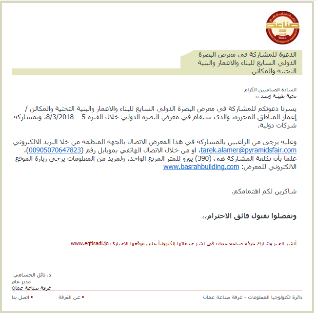 وعليه يرجى من الراغبين بالمشاركة في هذا المعرض الاتصال بالجهة المنظمة من خلا البريد الالكتروني tarek.alamer@pyramidsfair.com، او من خلال الاتصال الهاتفي بموبايل رقم (00905070647823)، علما بأن تكلفة المشاركة هي (390) يورو للمتر المربع الواحد، ولمزيد من المعلومات يرجى زيارة الموقع الالكتروني للمعرض: www.basrahbuilding.com
