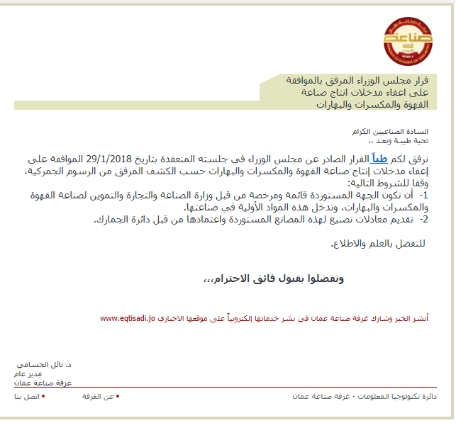 نرفق لكم طياً القرار الصادر عن مجلس الوزراء في جلسته المنعقدة بتاريخ 29/1/2018 الموافقة على إعفاء مدخلات إنتاج صناعة القهوة والمكسرات والبهارات حسب الكشف المرفق من الرسوم الجمركية، وفقا للشروط التالية: