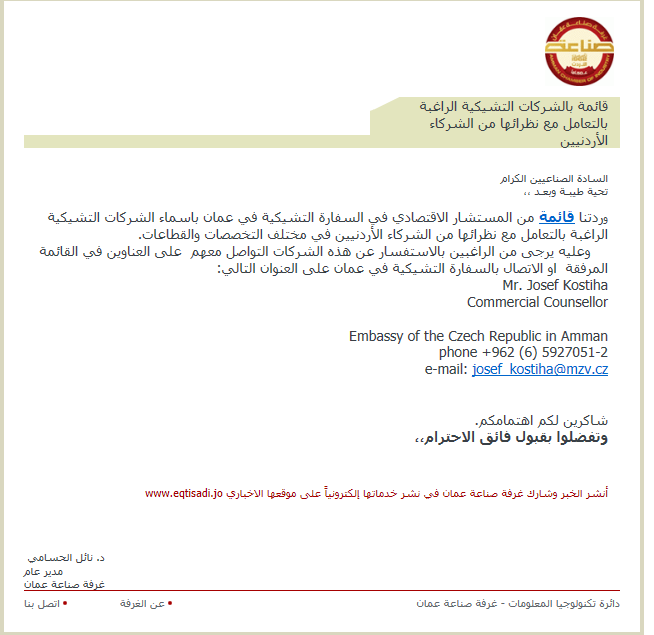 وردتنا قائمة من المستشار الاقتصادي في السفارة التشيكية في عمان باسماء الشركات التشيكية الراغبة بالتعامل مع نظرائها من الشركاء الأردنيين في مختلف التخصصات والقطاعات.