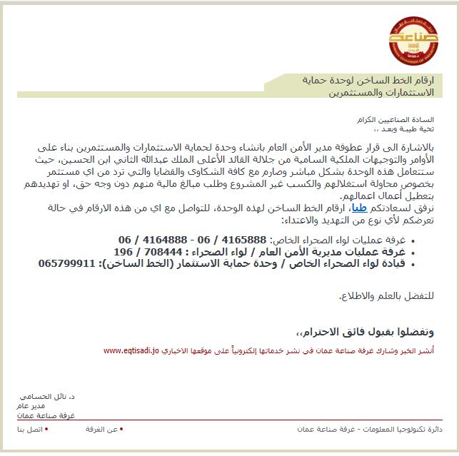 بالاشارة الى قرار عطوفة مدير الأمن العام بانشاء وحدة لحماية الاستثمارات والمستثمرين بناء على الأوامر والتوجيهات الملكية السامية من جلالة القائد الأعلى الملك عبدالله الثاني ابن الحسين، حيث ستتعامل هذه الوحدة بشكل مباشر وصارم مع كافة الشكاوى والقضايا والتي ترد من اي مستثمر بخصوص محاولة استغلالهم والكسب غير المشروع وطلب مبالغ مالية منهم دون وجه حق، او تهديدهم بتعطيل أعمال اعمالهم.