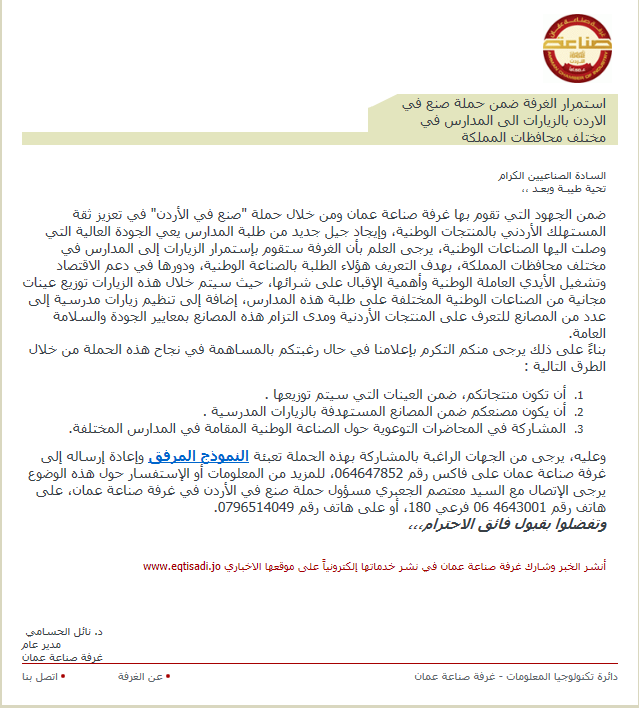 ضمن الجهود التي تقوم بها غرفة صناعة عمان ومن خلال حملة "صنع في الأردن" في تعزيز ثقة المستهلك الأردني بالمنتجات الوطنية، وإيجاد جيل جديد من طلبة المدارس يعي الجودة العالية التي وصلت اليها الصناعات الوطنية، يرجى العلم بأن الغرفة ستقوم بإستمرار الزيارات إلى المدارس في مختلف محافظات المملكة، بهدف التعريف هؤلاء الطلبة بالصناعة الوطنية، ودورها في دعم الاقتصاد وتشغيل الأيدي العاملة الوطنية وأهمية الإقبال على شرائها، حيث سيتم خلال هذه الزيارات توزيع عينات مجانية من الصناعات الوطنية المختلفة على طلبة هذه المدارس، إضافة إلى تنظيم زيارات مدرسية إلى عدد من المصانع للتعرف على المنتجات الأردنية ومدى التزام هذه المصانع بمعايير الجودة والسلامة العامة.