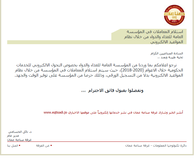 نرجو اعلامكم بما وردنا من المؤسسة العامة للغذاء والدواء بخصوص التحول الالكتروني للخدمات الحكومية خلال الاعوام (2018-2020)، حيث سيتم استلام المعاملات في المؤسسة من خلال نظام المواعيد الالكترونية بدلا من التسجيل الورقي، وذللك حرصا من المؤسسة على توفير الوقت والجهد.